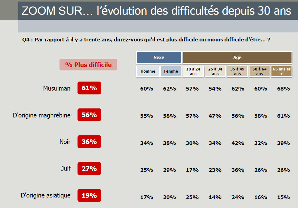 6 Français sur 10 pensent que le racisme a plutôt augmenté au cours des trente dernières années (59%). Seuls 1 sur 10 pense le contraire. 68% des Français pensent qu’il est difficile d’être d’origine maghrébine en France aujourd’hui. Et 56% des Français qu’il est plus difficile encore d’être d’origine maghrébine en France qu’il y a trente ans. Dans ce contexte, 74% des Français pensent que le racisme constitue aujourd’hui un danger pour la société française.