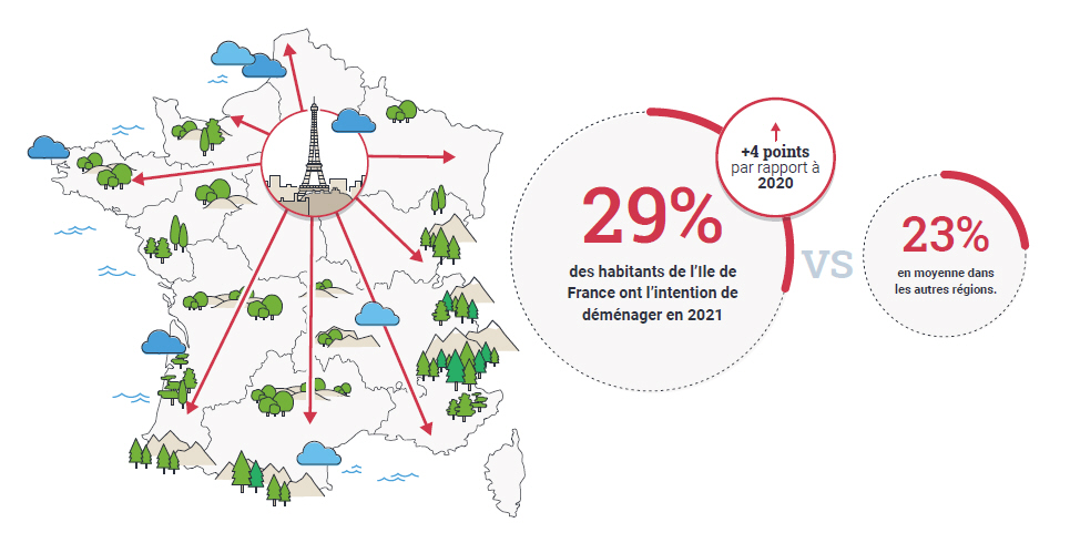 Les franciliens sont plus nombreux que la moyenne à se déclarer concernés par ce type de projet. 29% d’entre eux évoquent des intentions de déménagement pour 2021 (ils étaient 24% en 2020), contre 23% en moyenne dans les autres régions.